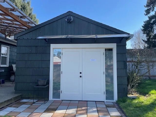 This location is in the Kenton neighborhood in N Portland. Pamela has renovated her detached garage to be an acupuncture studio. The entrance and street parking are on N Montana St.